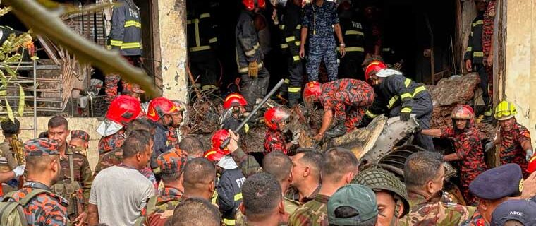 ڈھاکا: بنگلا دیش فضائیہ کے تربیتی طیارے کے ہائی سکول کیمپس پر گرنے کے حادثے میں ہلاکتوں کی تعداد 27 ہوگئی۔سرکاری حکام کے مطابق گزشتہ روز پیش آنے والے ایف-7 تربیتی طیارہ حادثے میں ہلاک ہونے والوں میں 25 طلبہ اور طیارے کا پائلٹ بھی شامل ہے، حادثے میں 170 کے قریب افراد زخمی بھی ہوئے ہیں جن میں طلبہ کی بڑی تعداد شامل ہے، ان کی عمریں 12 سے 16 سال کے درمیاں ہیں۔فوجی ترجمان کا کہنا ہے کہ ٹیک آف کے فوراً بعد طیارے میں تکنیکی خرابی پیدا ہوئی، پائلٹ نے طیارے کو آبادی سے دور لے جانے کی کوشش کی مگر وہ کامیاب نہ ہو سکا۔بنگلادیشی حکام کا کہنا ہے کہ حادثے کی تحقیقات کے لیے سرکاری سطح پر کمیٹی قائم کر دی گئی ہے۔