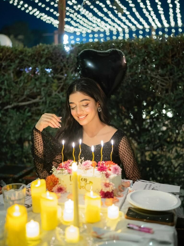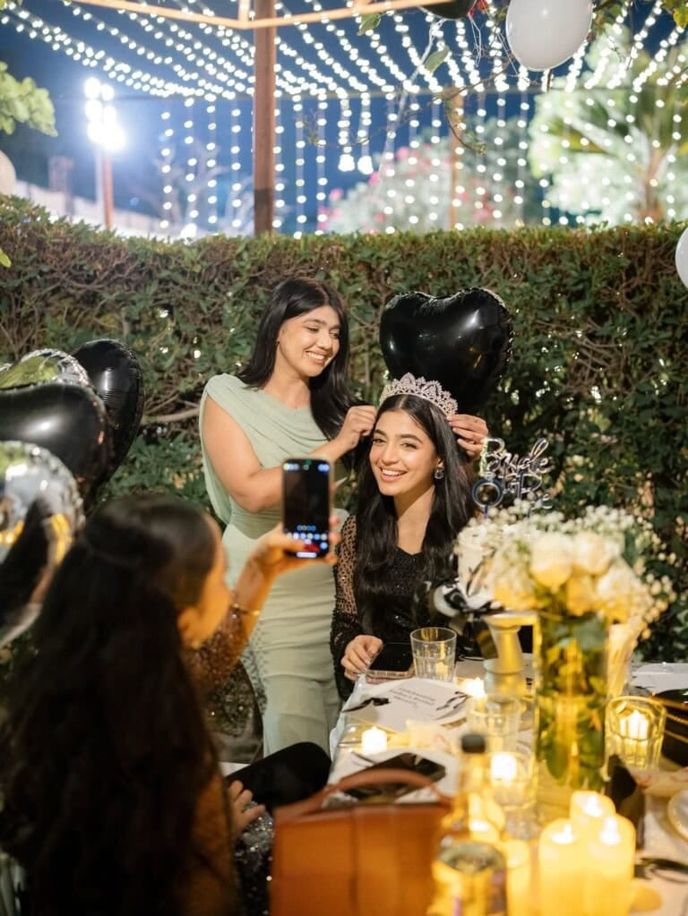 حال ہی میں منعقد ہونے والے برائیڈل شاور کو اداکارہ نے اپنی بہن اور قریبی دوستوں کے ہمراہ خوب انجوائے کیا۔ اس موقع پر لائبہ خان نے بلیک فلور لینتھ میکسی زیب تن کی، جس کا نیٹ ٹاپ نفیس چمکدار سیکوئنز اور باریک موتیوں کے کام سے مزین تھا۔